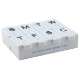 A pill organizer to schedule and guide correct dosages for a week-long period. Features a pill splitter with small metal blade, airline safe and snap closure.